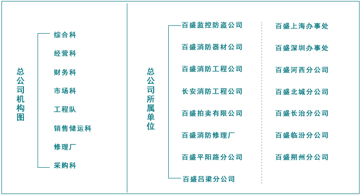 太原市百盛消防器材有限公司 隸屬于山西百盛總公司,是經山西省、市消防部門批準,成立于1993年9月3日的股份有限公司。公司注冊資金500萬元,現有職工50余人,占地面積約1105平方米,主要經銷、安裝、維修消各類消防器材。多年來我公司本著以客戶需求為己任,以市場發展為導向的理念,以追求產品質量第一,產品服務一流的原則使我公司逐步成為消防行業的領先企業。